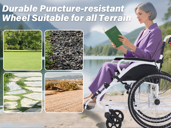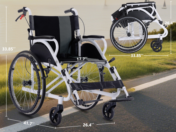 JCD-2418-Foldable hand-push, self-propelled wheelchair, portable wheelchair for adults and seniors, 30 lbs. net weight, 230 lbs. load capacity, with footrests, large size wheels, double hand brakes.
